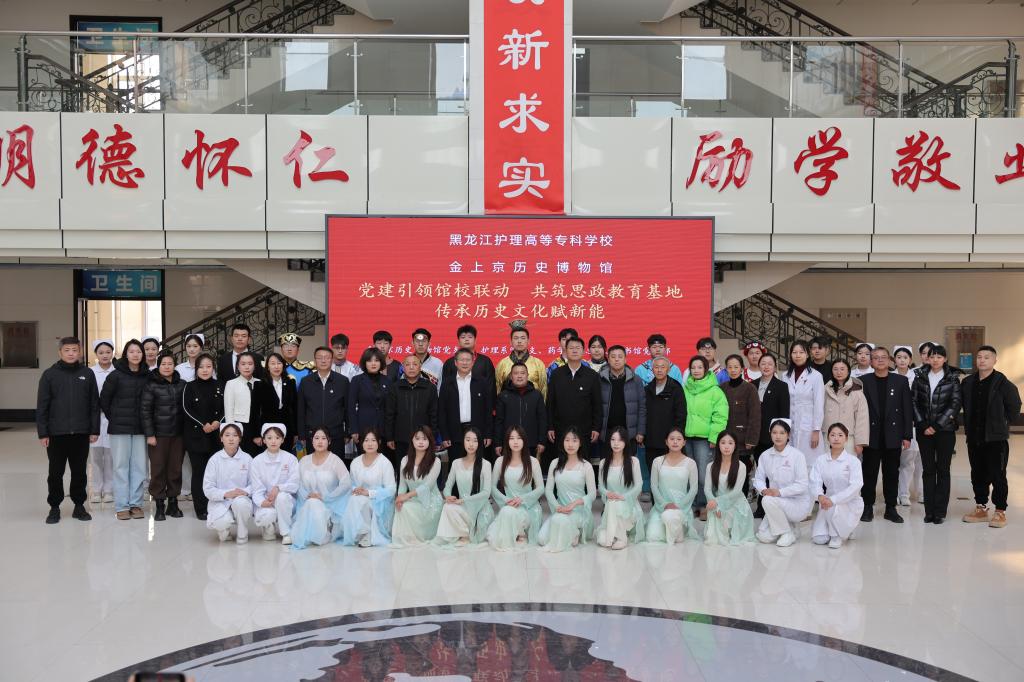 白山黑水镌刻千年文脉,金源故地激荡育人新声。11月12日,在阿城校区开展了黑龙江护理高等专科学校与金上京历史博物馆共建“思政教育基地”签约揭牌仪式暨党建联建活动。出席活动的校领导和嘉宾有校党委书记田国忠、党委副书记王敬春、副校长杨丽妲、纪委书记于新宇、副校长于沛君、金上京历史博物馆副馆长郭万勋、魏振江,学校宣传统战部、图书馆、护理系、药学系等党员师生代表参加了活动 。