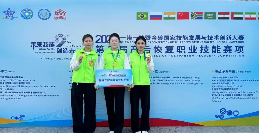 2025年一带一路暨金砖国家技能发展与技术创新大赛“第二届产后恢复职业技能”赛项于11月27日至12月1日在湖南衡阳圆满举办。经过激烈角逐,我校护理系李萱、王子璇、赵鑫鑫三名同学,在刘慧、邰东玲老师的悉心指导下,凭借扎实的专业理论、精湛的操作技能和出色的临场表现,从全国32支参赛队伍中脱颖而出,勇夺大赛一等奖,充分展现了我校学子的卓越风采和学校的育人成效。